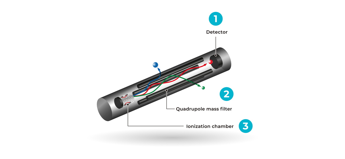 Im BELMASS II Massenspektrometer werden Gasmoleküle in der Ionisationskammer ionisiert und wandern durch den Quadrupol-Massenfilter zum Detektor. Der Massenfilter besteht aus vier parallelen Stäben. Zwischen jedem gegenüberliegenden Stabpaar wird eine Hochfrequenzspannung mit einer Offset-Gleichspannung angelegt.