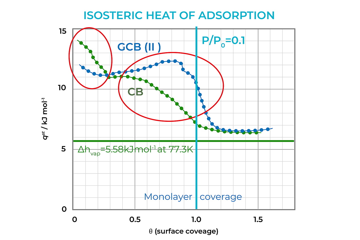 Example: N2 isosteric heat evaluation at 77.4 K using adsorption isotherms at 77.4 K, 82.4 K, and 87.4 K.