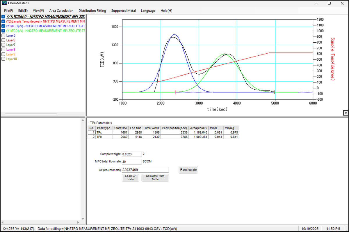 Quantidade de dessorção: 0,527 cm³/g, Taxa de dispersão metálica: 22,7%, Área superficial metálica 1,13 m²/g, Tamanho da partícula metálica: 4,99 nm. Correção de linha de base totalmente automatizada e integração de pulsos para avaliação de dados sem esforço.