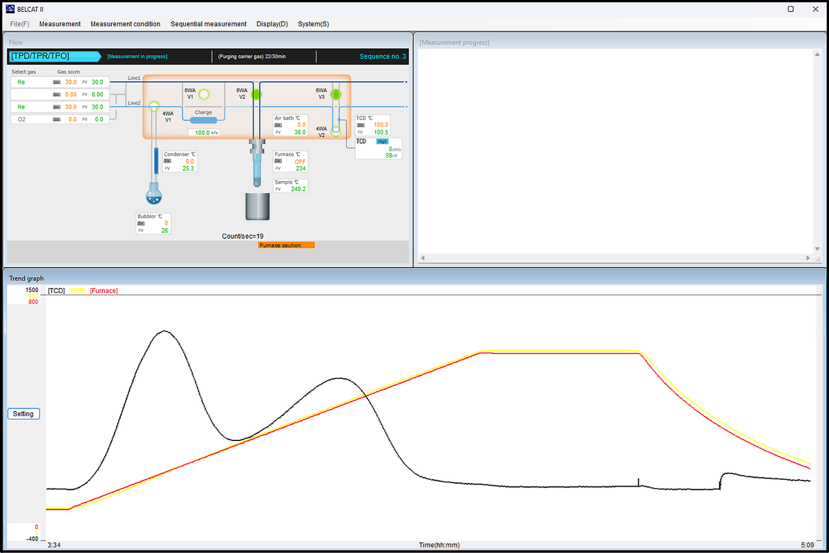 | Função de medição de operação simples | Abas dedicadas para análises padrão (TPR, TPD, TPO e BET) permitem a programação fácil e o monitoramento em tempo real do status operacional, gráficos de TCD, temperatura e taxas de fluxo. |